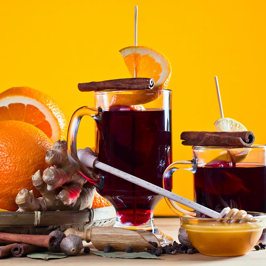 Обои Глинтвейн на столе с имбирем, апельсино и специями
