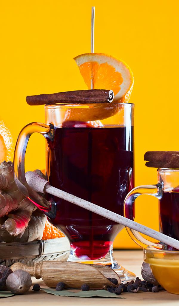 Обои Глинтвейн на столе с имбирем, апельсино и специями