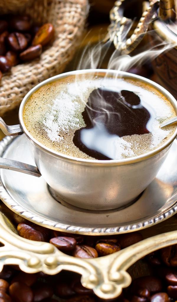 Обои Чашка горячего вкусного кофе на столе с зернами