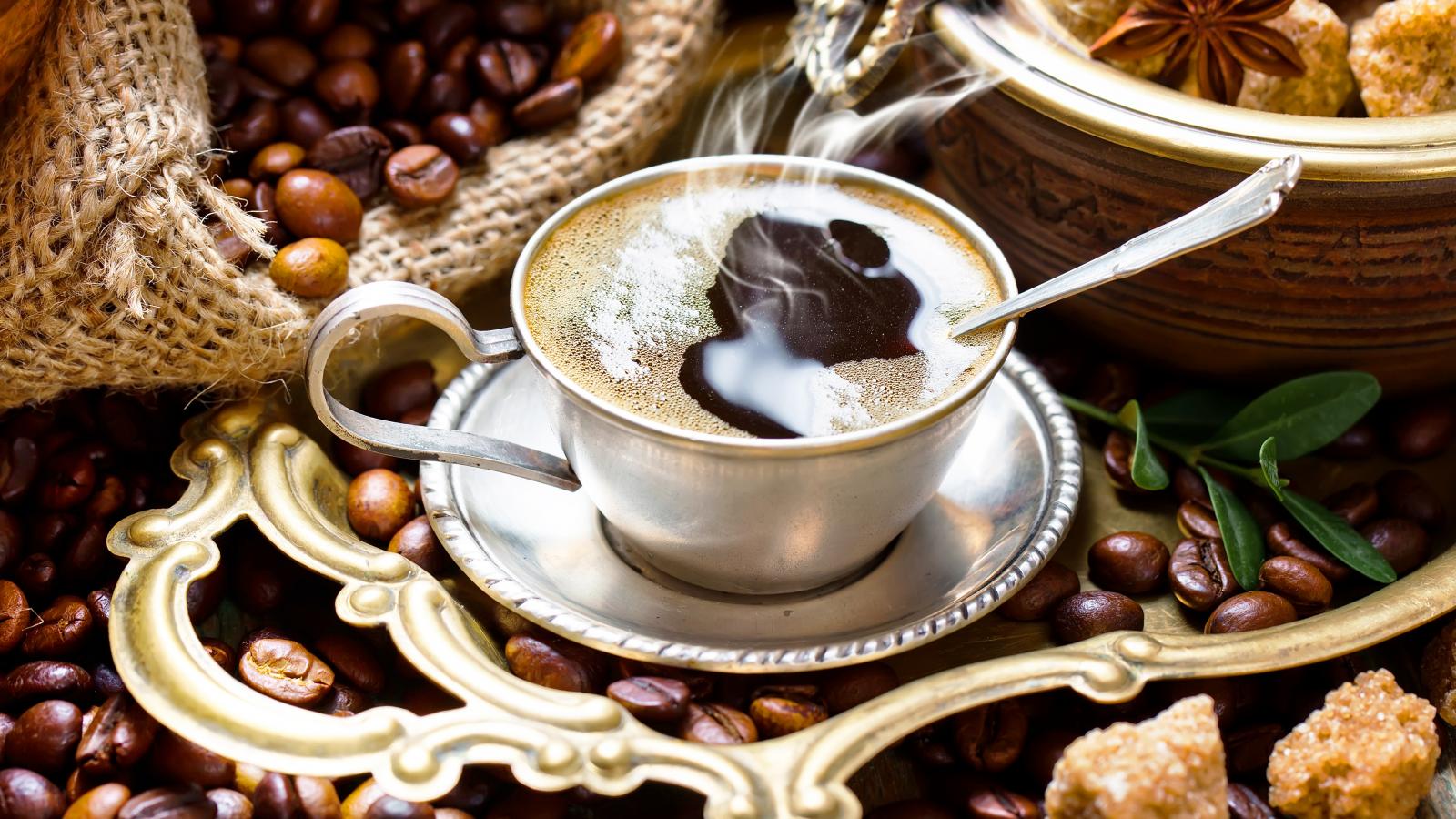 Обои Чашка горячего вкусного кофе на столе с зернами