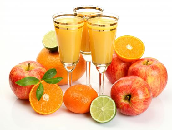 Обои Сок в фужерах на столе с яблоками и мандаринами