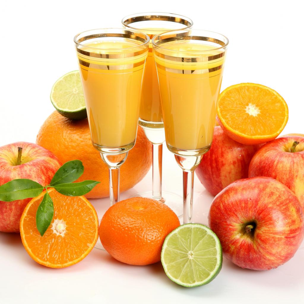 Обои Сок в фужерах на столе с яблоками и мандаринами