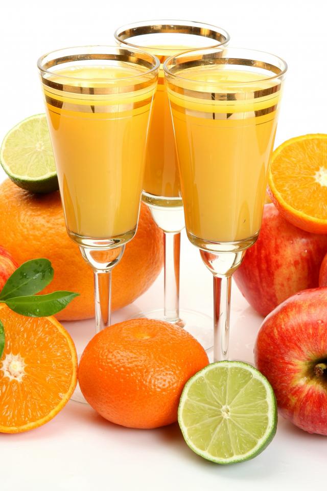 » Обои Сок в фужерах на столе с яблоками и мандаринами