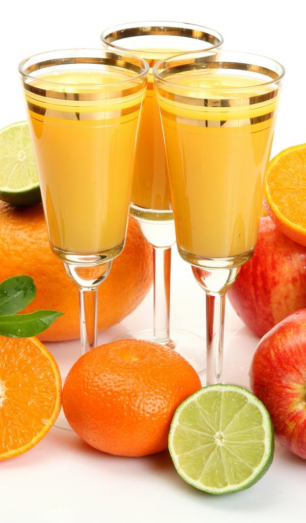 Обои Сок в фужерах на столе с яблоками и мандаринами