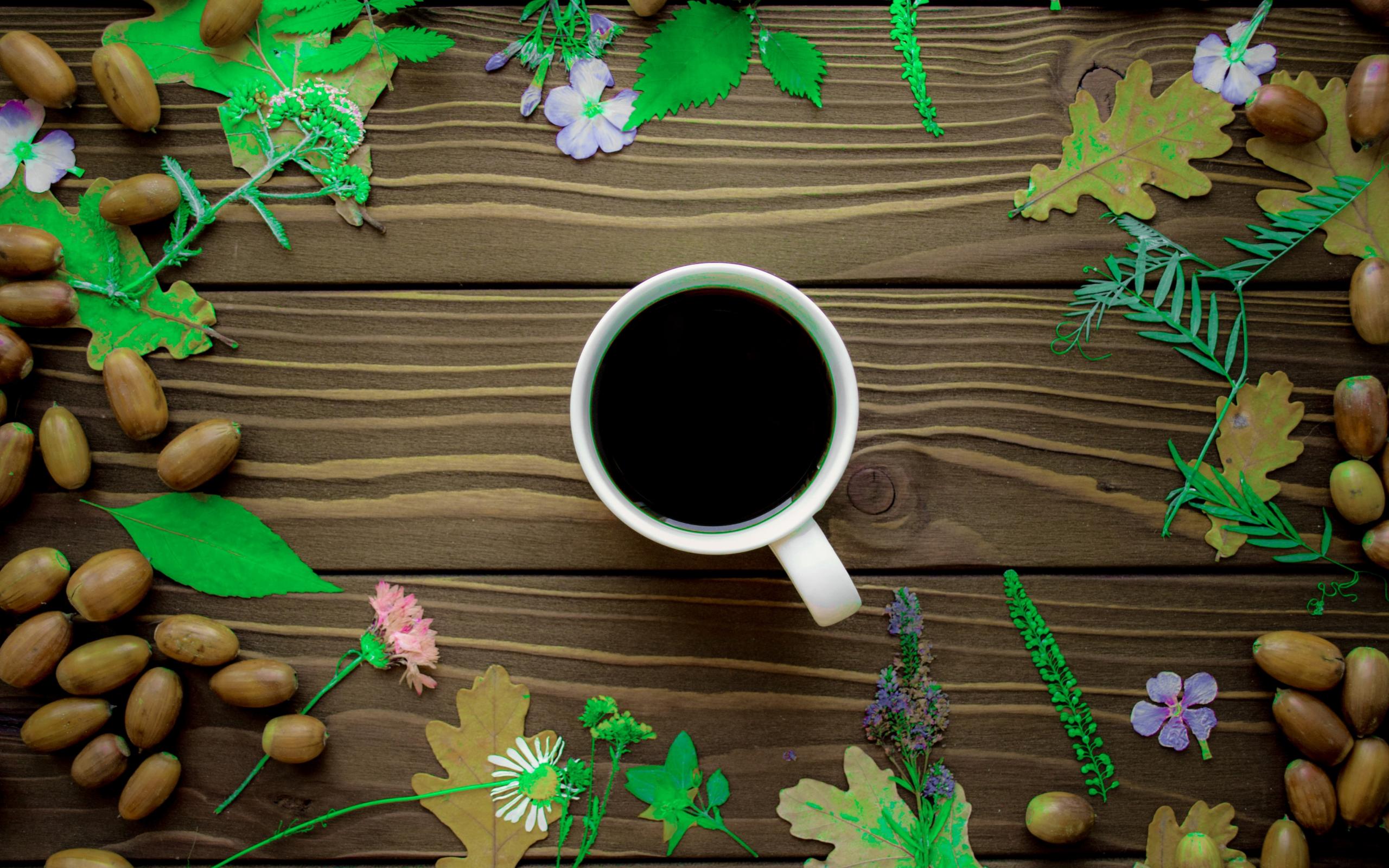Обои Чашка кофе на столе с желудями
