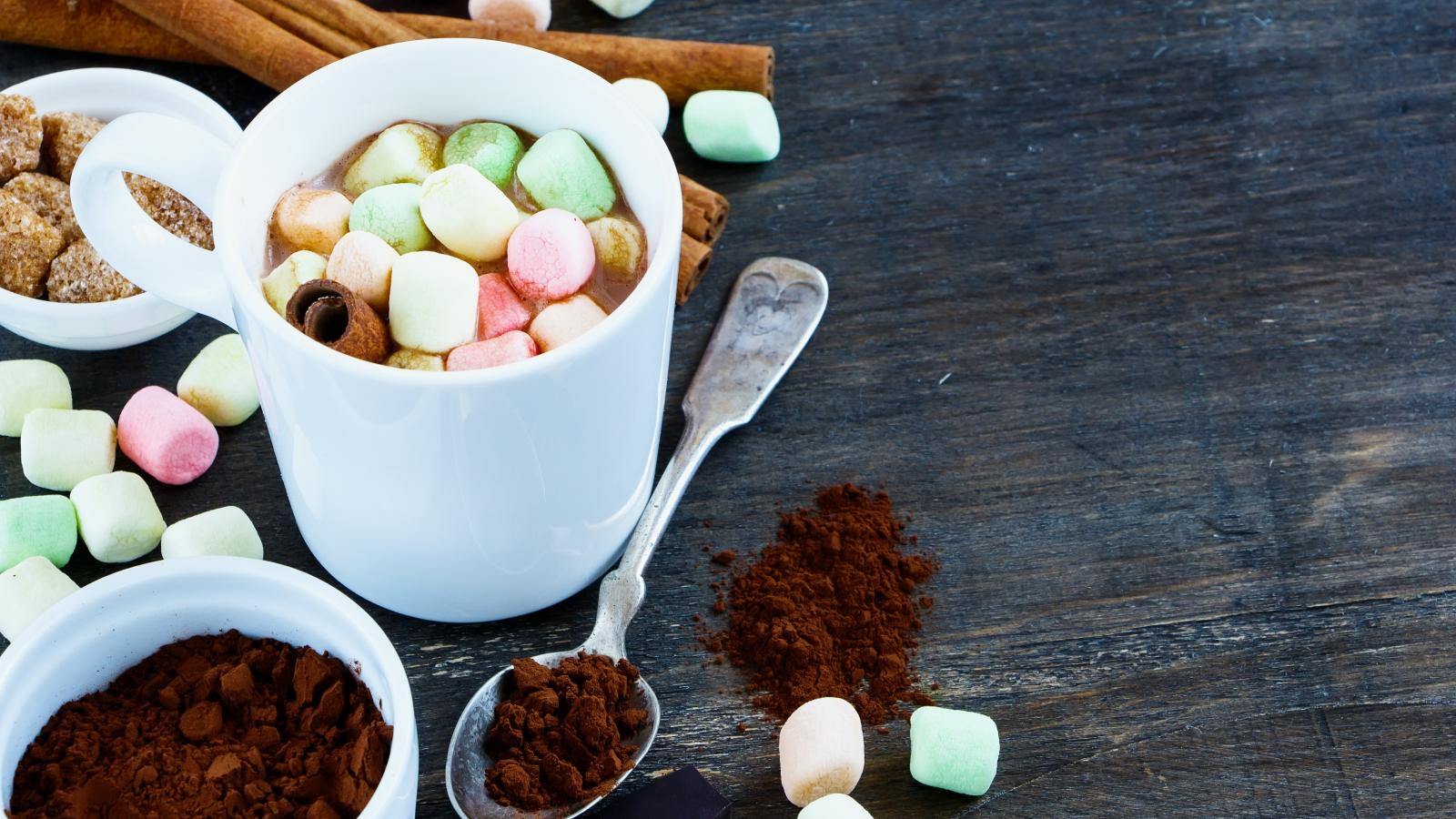 Обои Кофе с маршмеллоу на столе с корицей и сахаром