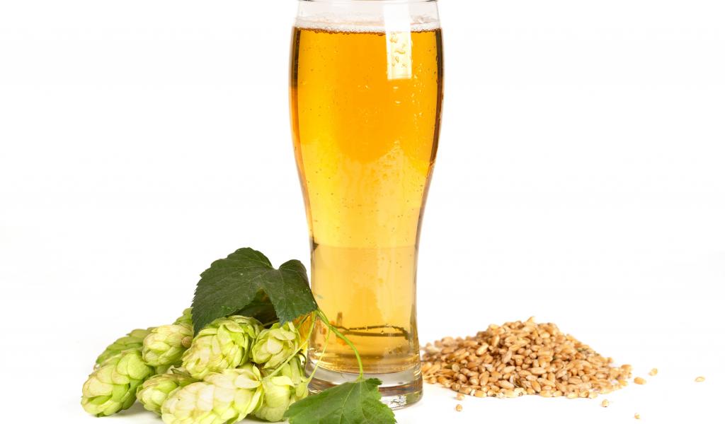 Обои Бокал холодного пива на белом фоне с хмелем и зернами пшеницы