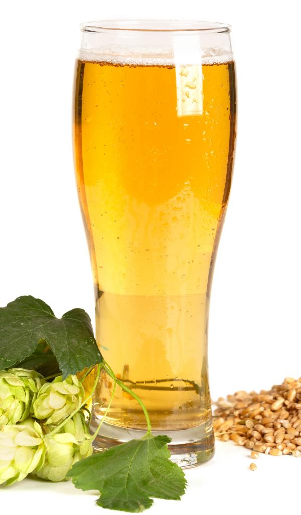 Обои Бокал холодного пива на белом фоне с хмелем и зернами пшеницы