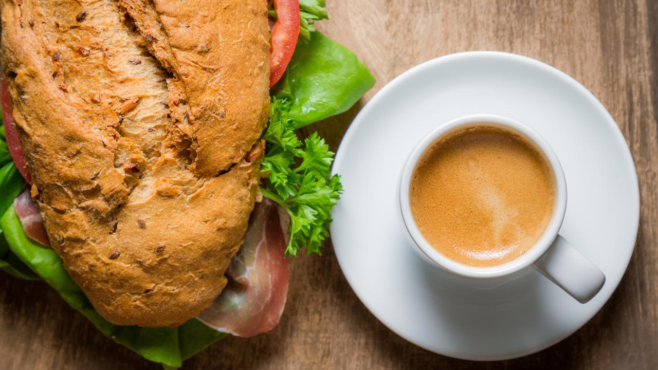 Обои Чашка кофе с бутербродом на столе к завтраку