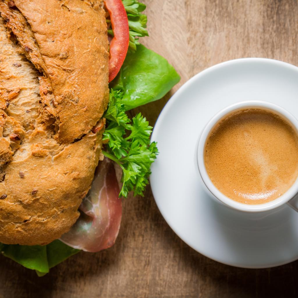 Обои Чашка кофе с бутербродом на столе к завтраку
