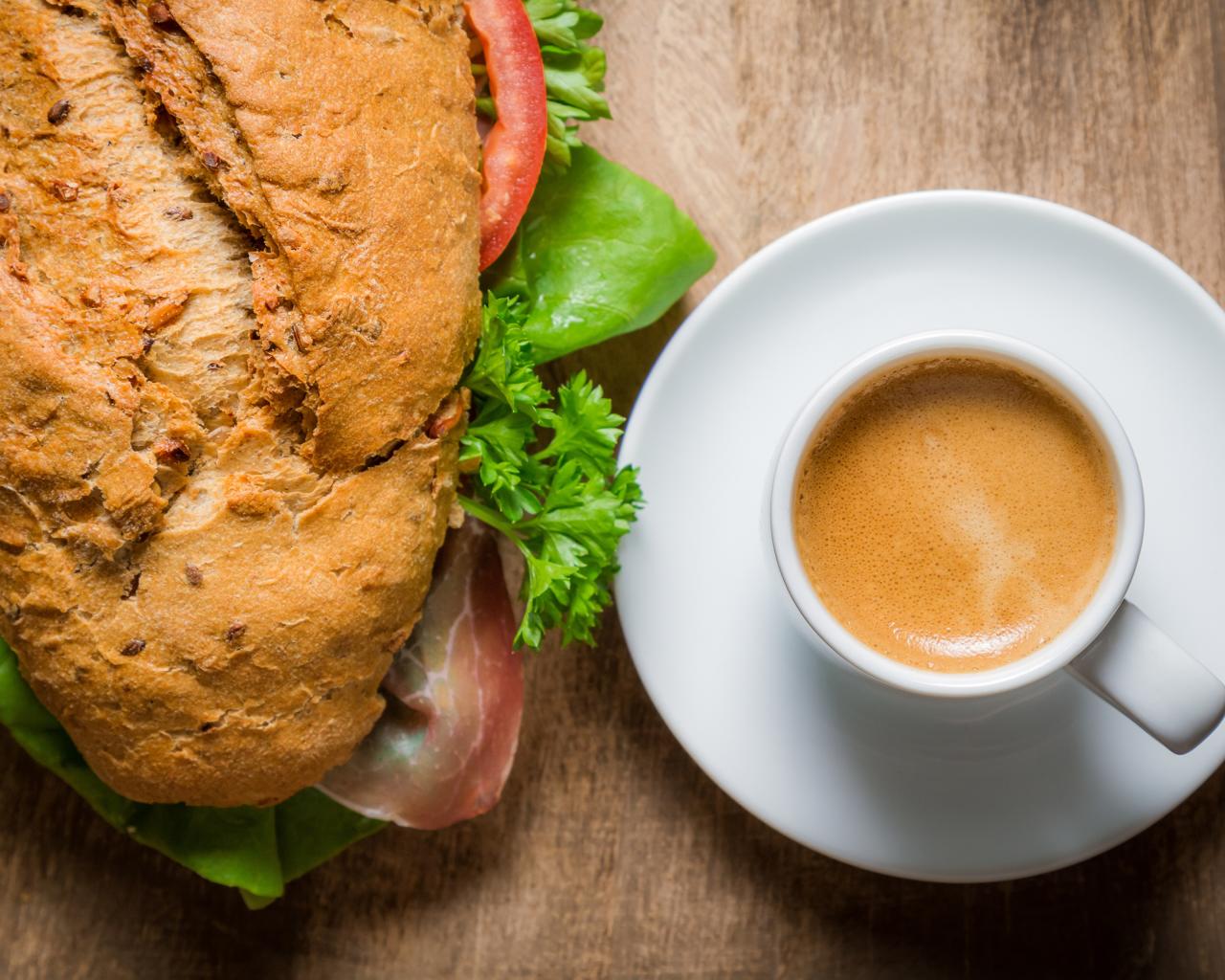 Обои Чашка кофе с бутербродом на столе к завтраку