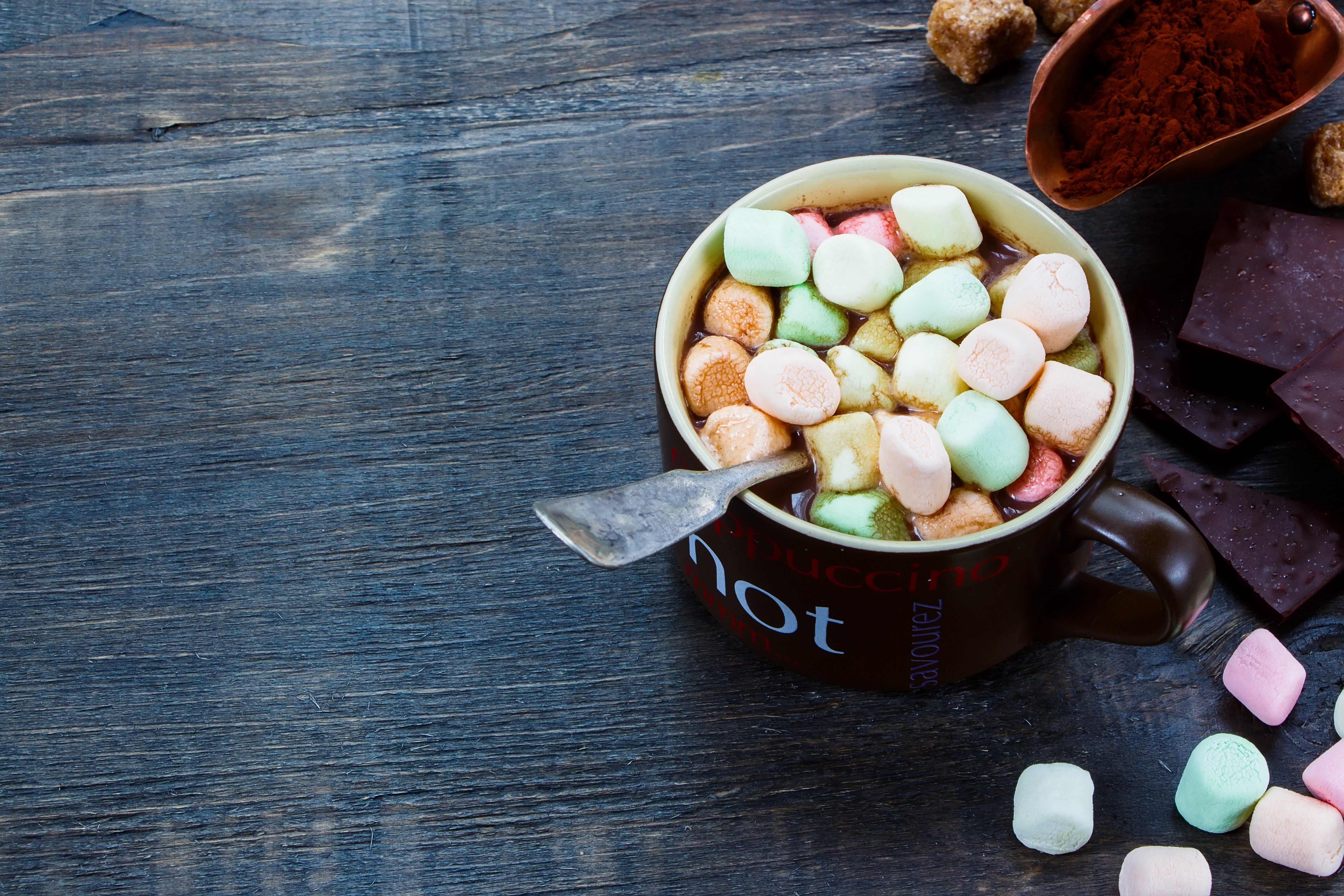 Обои Горячий шоколад с маршмеллоу на столе с плитками