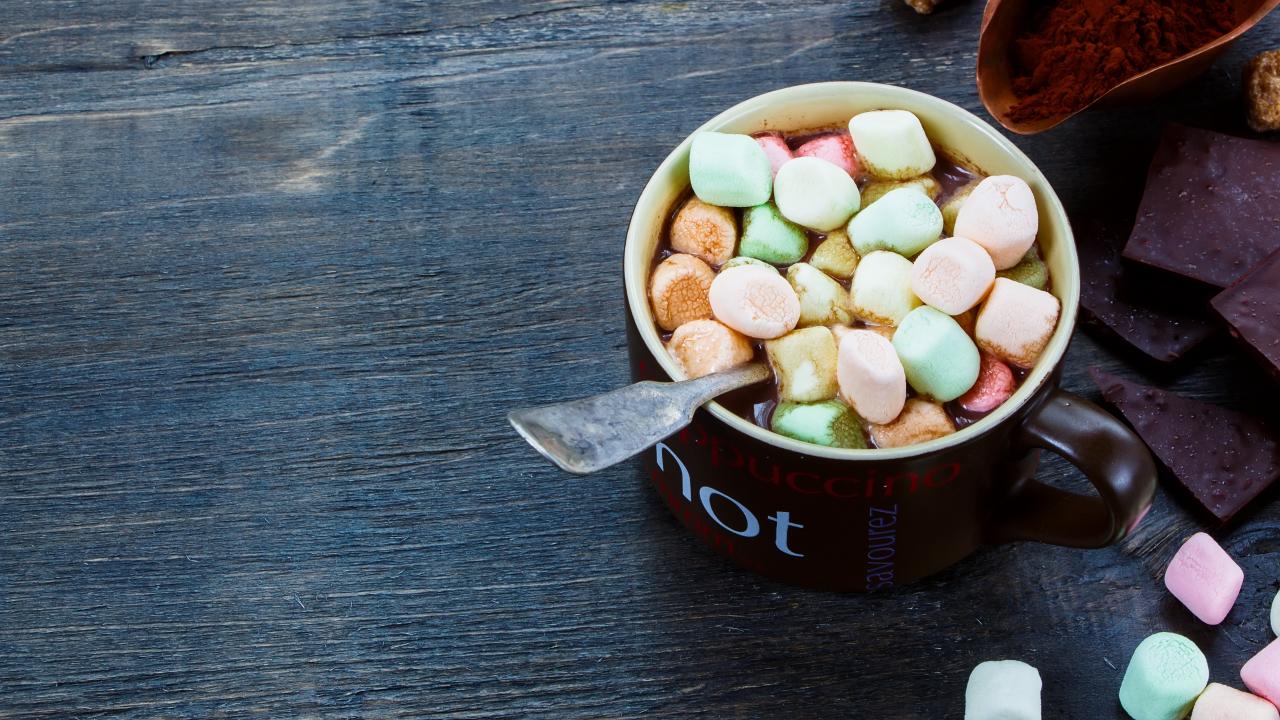 Обои Горячий шоколад с маршмеллоу на столе с плитками