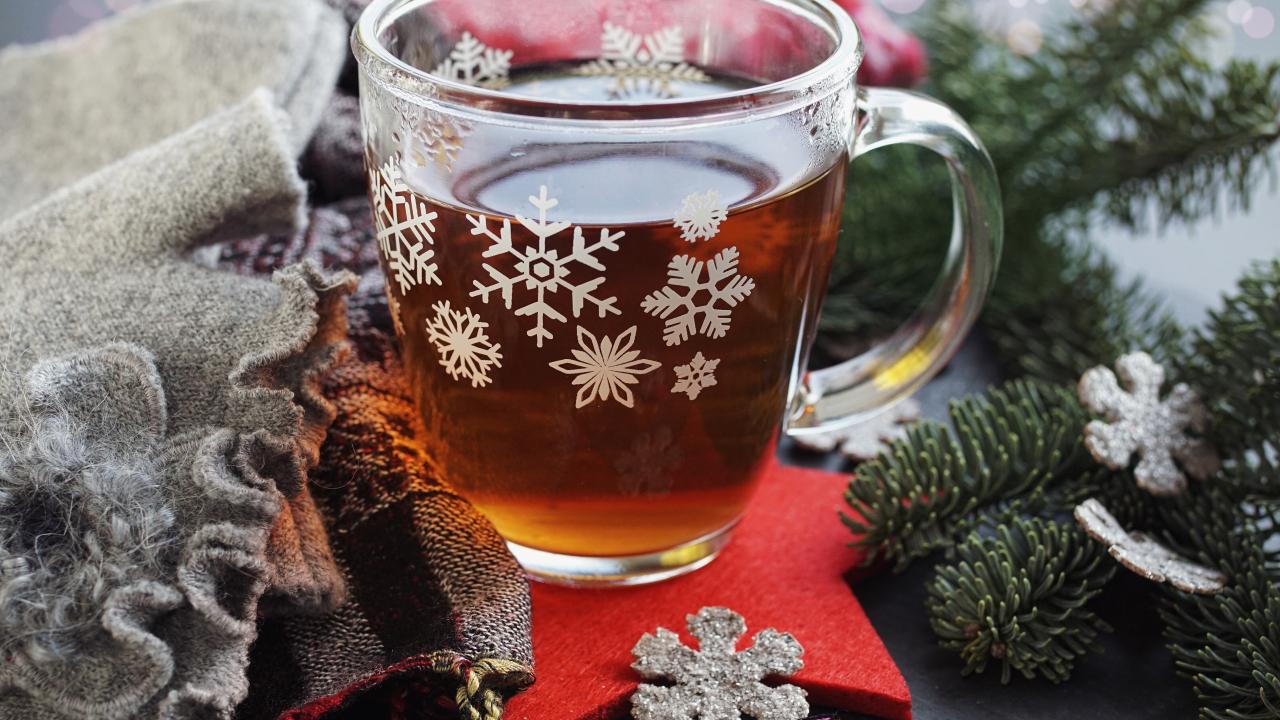 Обои Стеклянная чашка чая на столе с ветками ели и шарфом