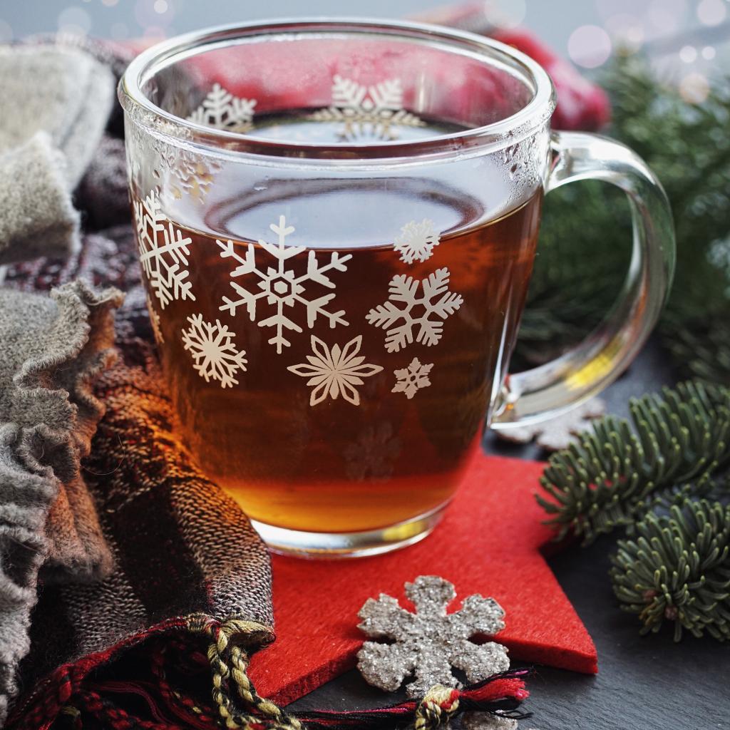 Обои Стеклянная чашка чая на столе с ветками ели и шарфом