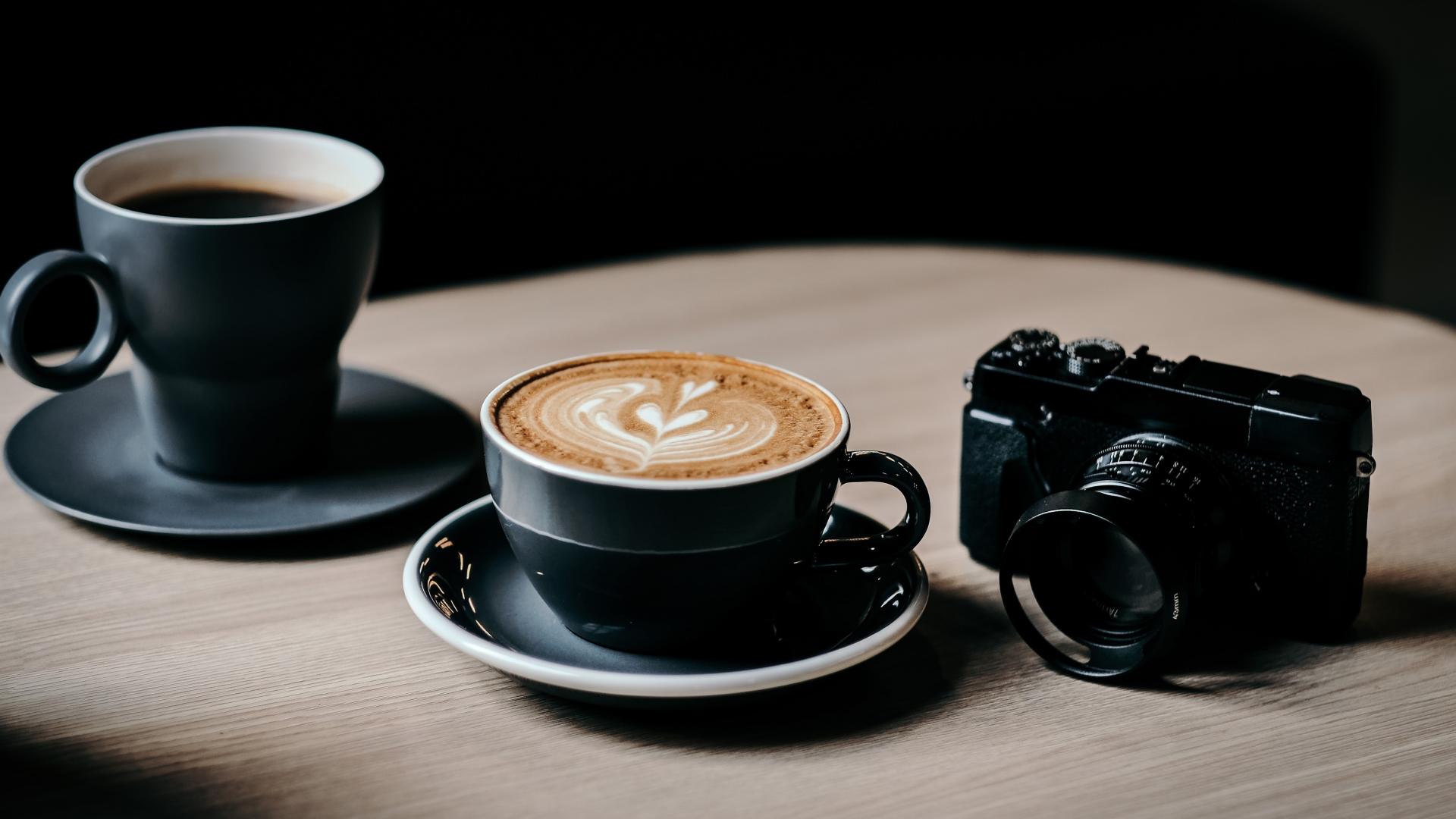 Обои Две чашки кофе на столе с фотоаппаратом