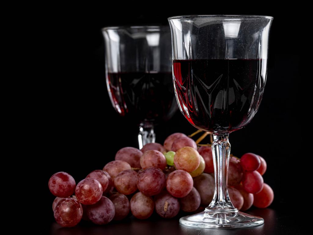 Обои Два бокала вина на черном фоне с виноградом