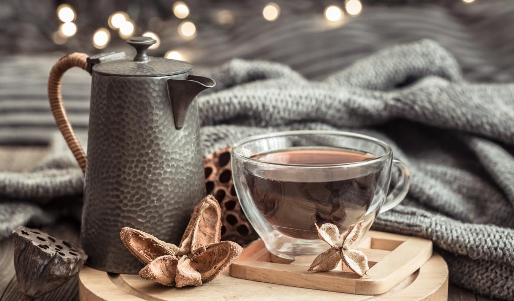 Обои Чашка чая на столе с чайником и теплым пледом