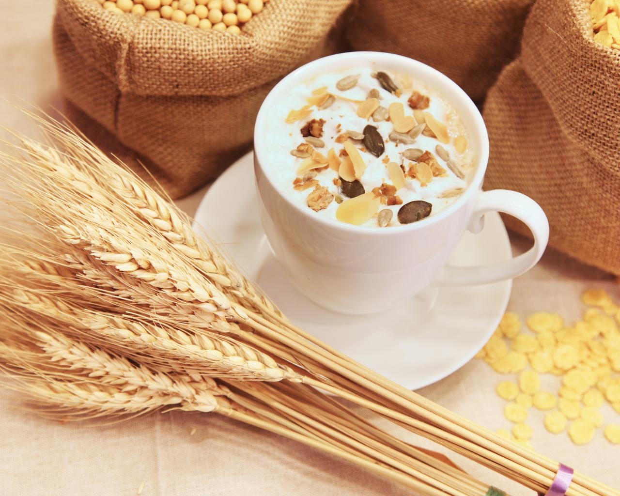 Обои Чашка молока с мюсли на столе с колосками