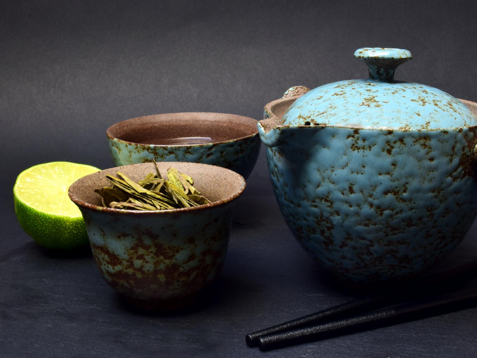 Обои Зеленый чай на столе с посудой и лаймом