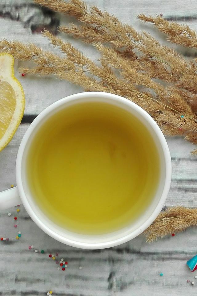 Обои Чашка чая на столе с лимоном и колосьями