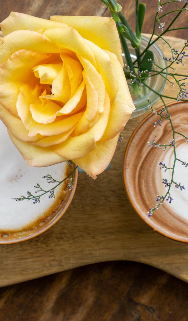 Обои Две чашки капучино на столе с розой