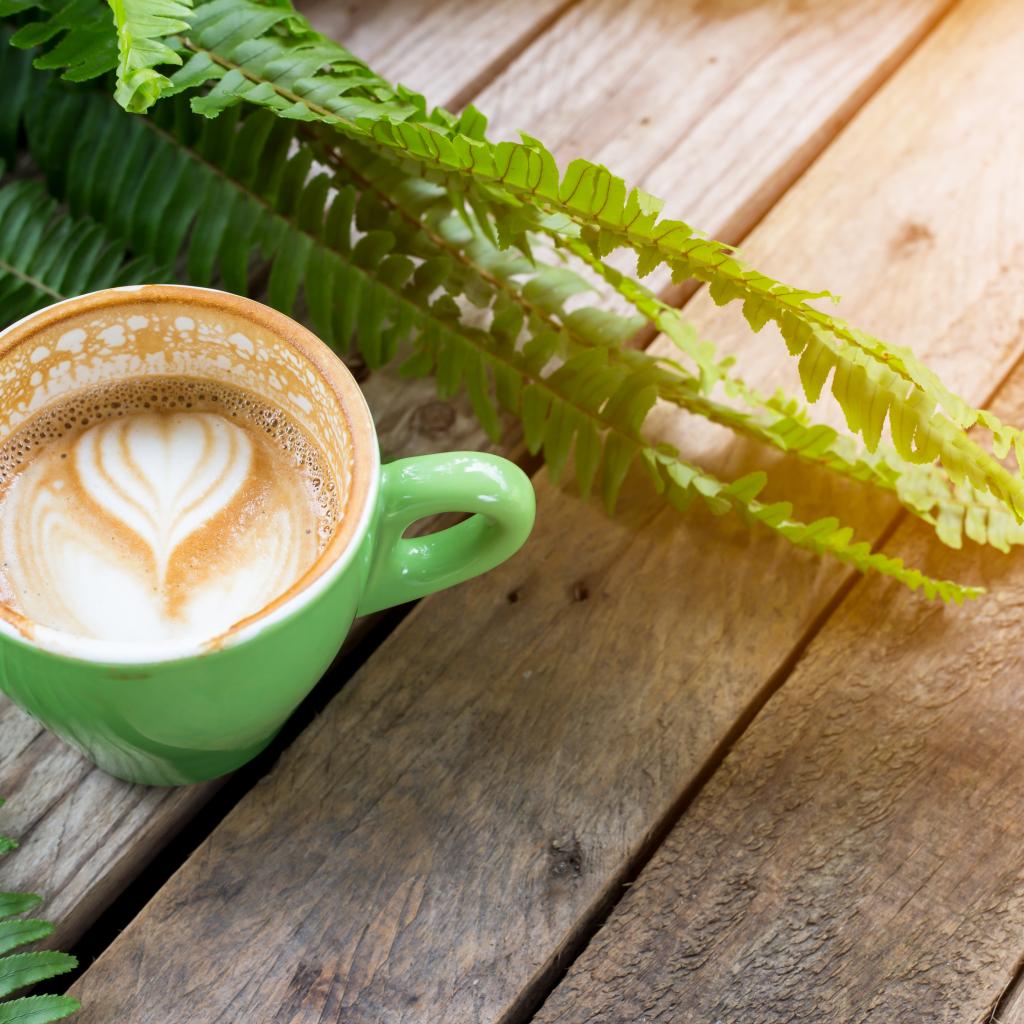 Обои Чашка вкусного капучино на столе с листьями папоротника