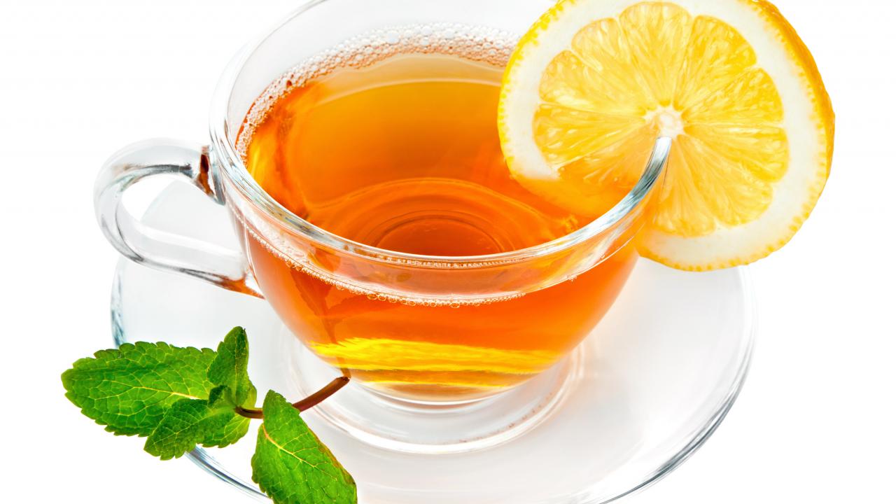 Обои Чашка чая с лимоном и мятой на белом фоне