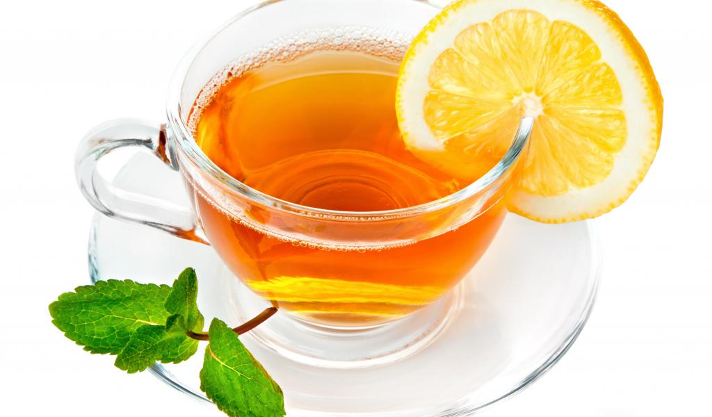 Обои Чашка чая с лимоном и мятой на белом фоне