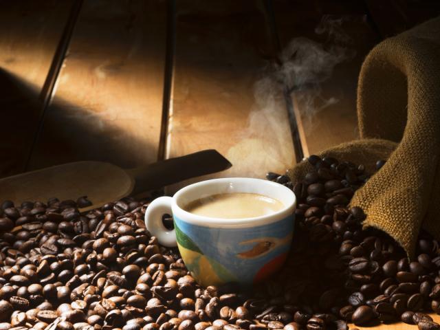 Обои Чашка горячего кофе стоит на зернах