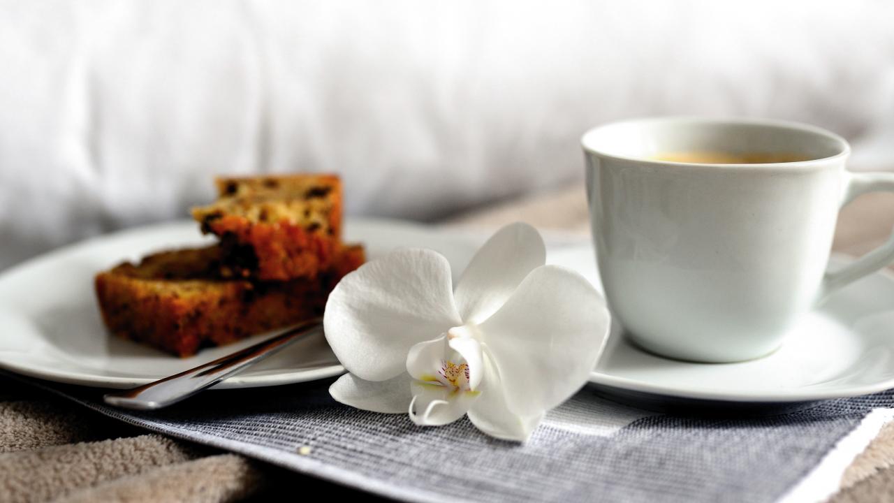 Обои Чашка кофе на столе с цветком орхидеи и кусочками кекса