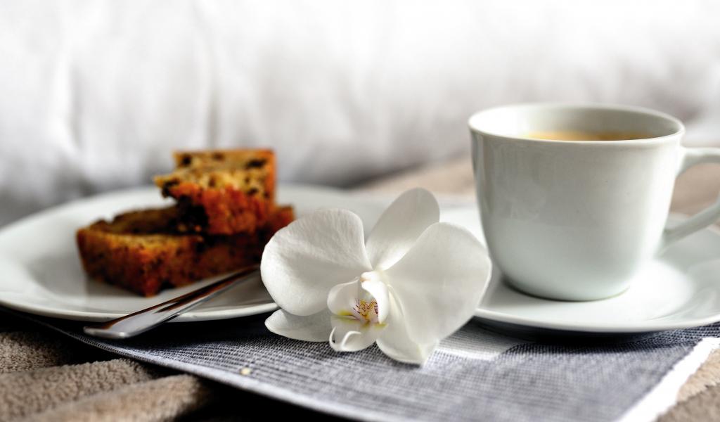 Обои Чашка кофе на столе с цветком орхидеи и кусочками кекса