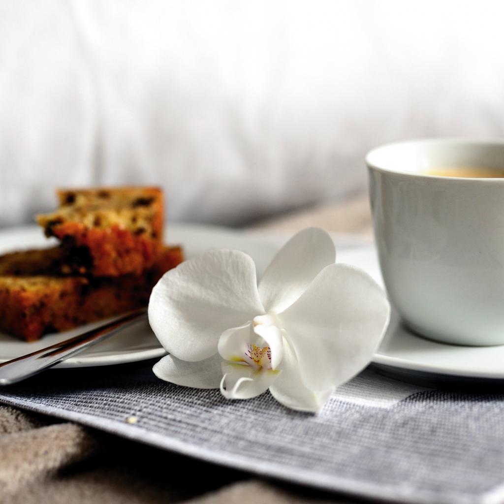 Обои Чашка кофе на столе с цветком орхидеи и кусочками кекса