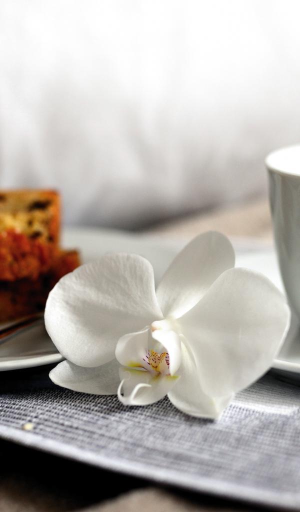 Обои Чашка кофе на столе с цветком орхидеи и кусочками кекса