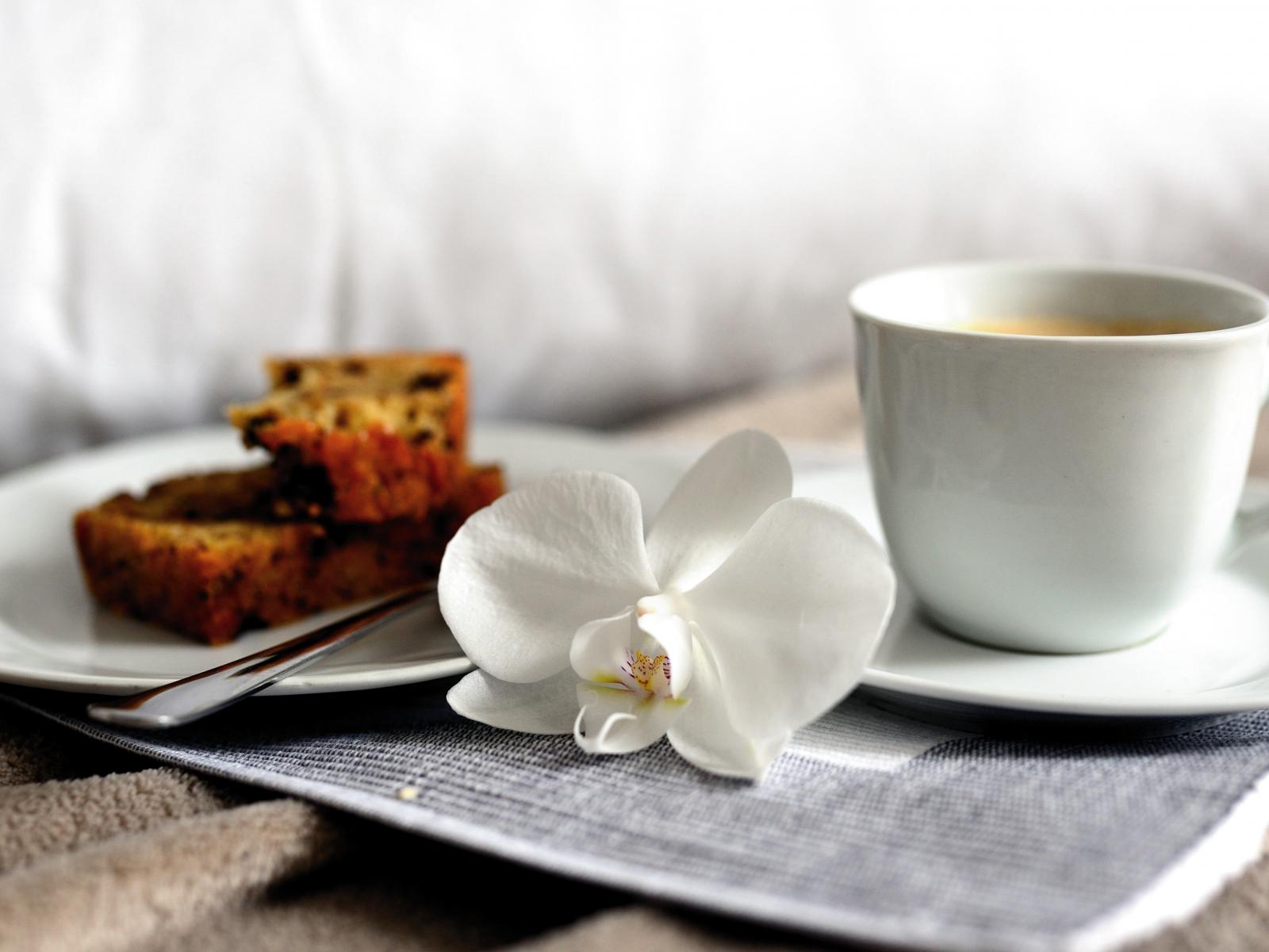Обои Чашка кофе на столе с цветком орхидеи и кусочками кекса