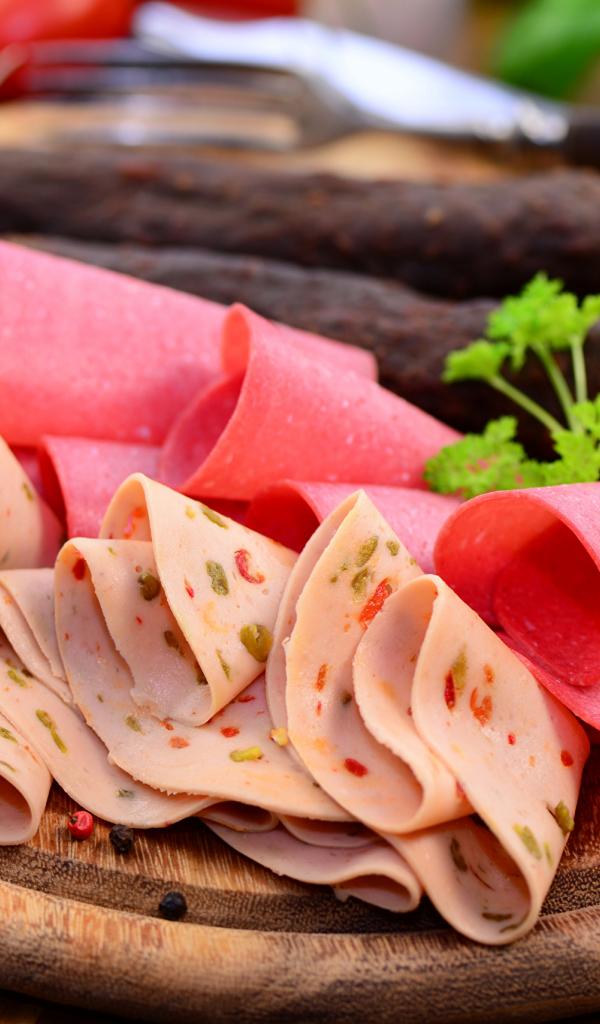 Обои Колбасная нарезка на деревянной доске