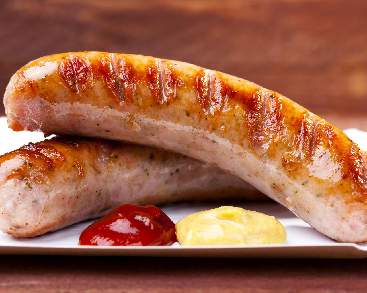 Обои Сосиски барбекю на столе с соусом
