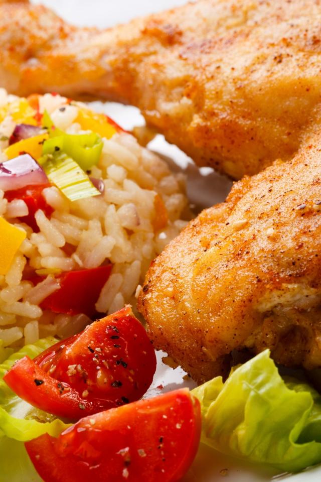 Обои Аппетитный жареный куриный окорочок с рисом и овощами