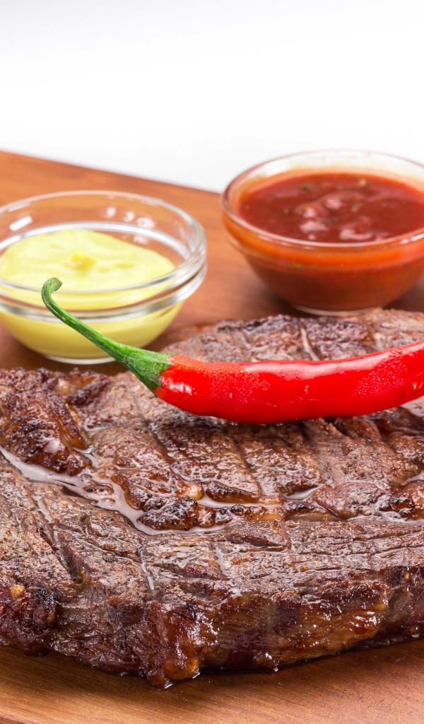 Обои Сочный кусок мяса с перцем чили и соусами
