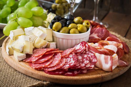 Обои Мясная нарезка с сыром и оливками на разделочной доске