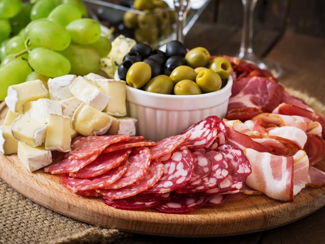 Обои Мясная нарезка с сыром и оливками на разделочной доске