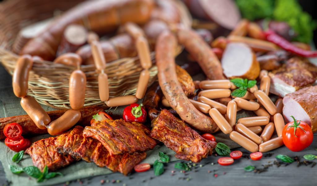 Обои Копченые ребрышки с колбасой на столе