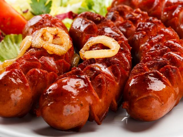 Обои Жареные сосиски с кольцами лука