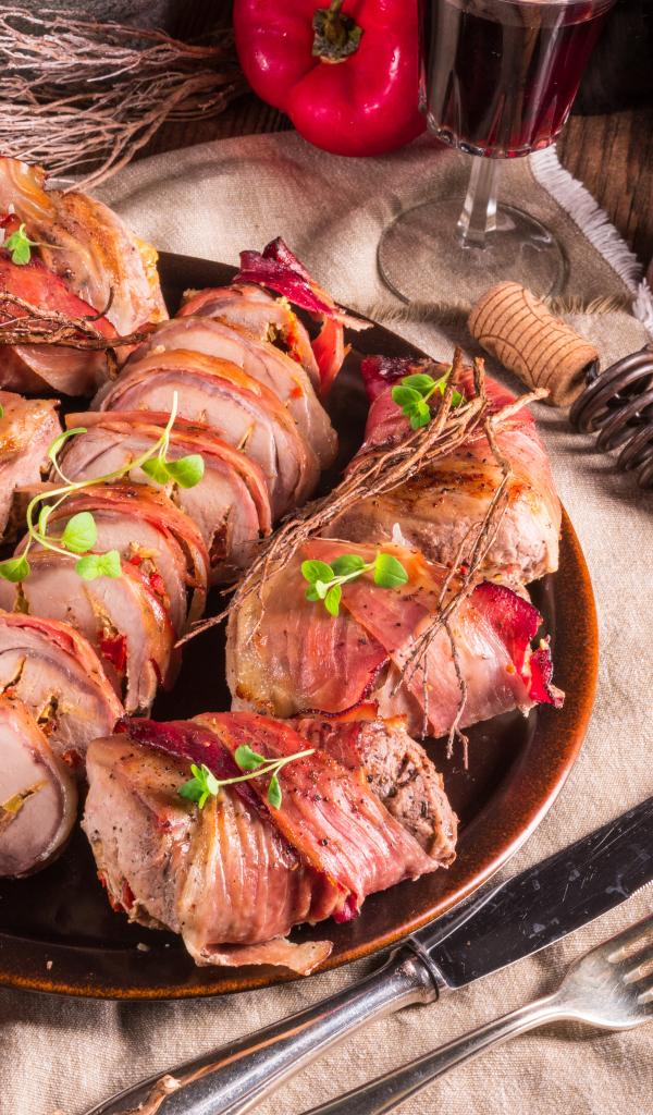 Обои Нарезанные мясные рулеты на столе с хлебом