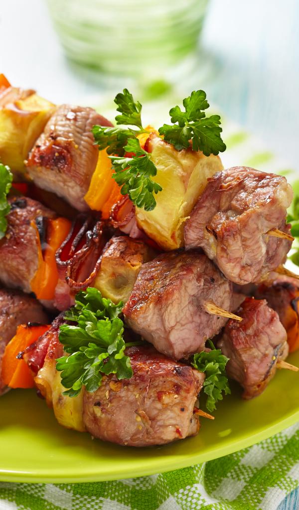 Обои Шашлык с овощами на тарелке на столе