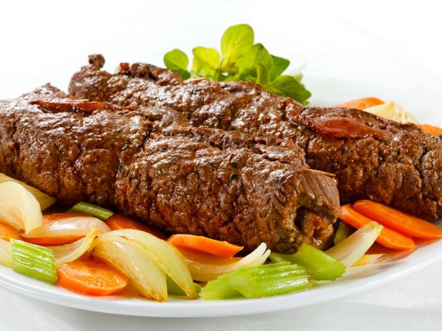 Обои Свинина на тарелке с овощами на белом фоне