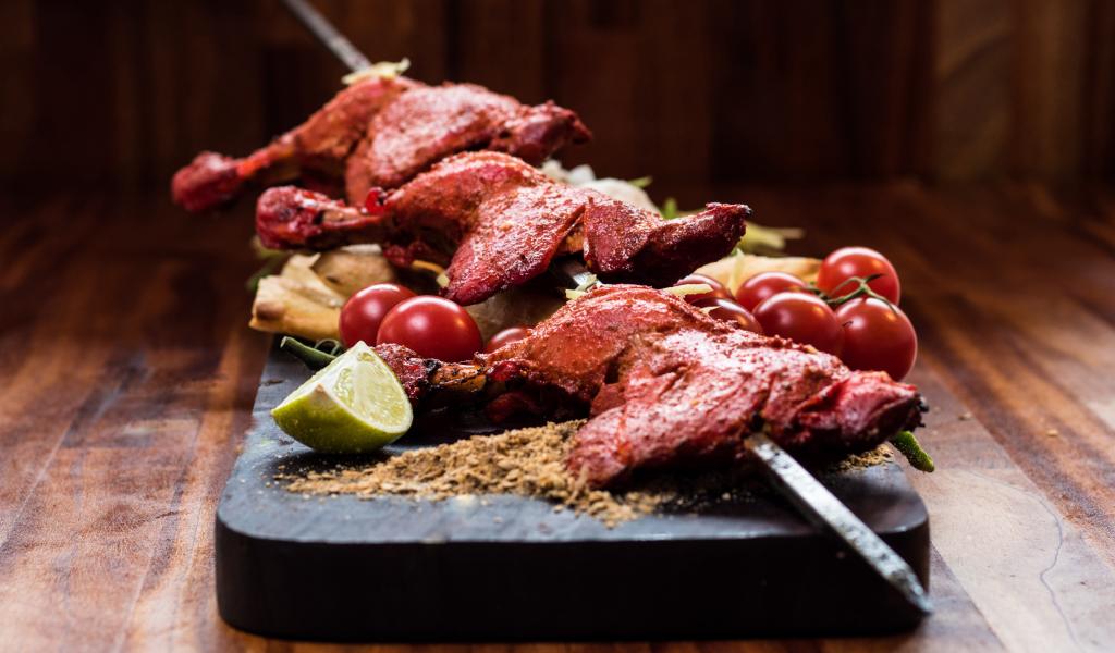 Обои Курица жареная на шампурах на столе с овощами