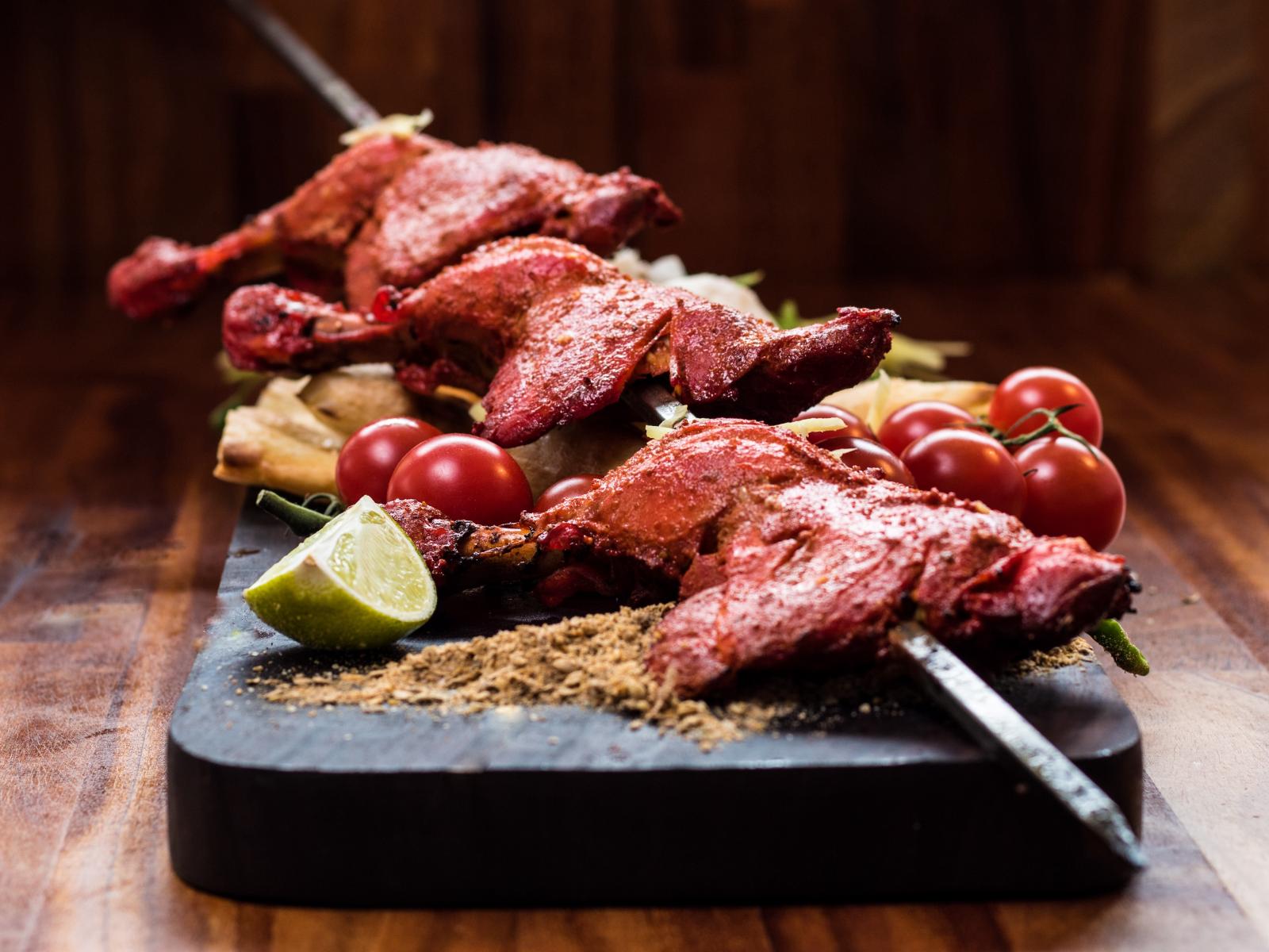 Обои Курица жареная на шампурах на столе с овощами