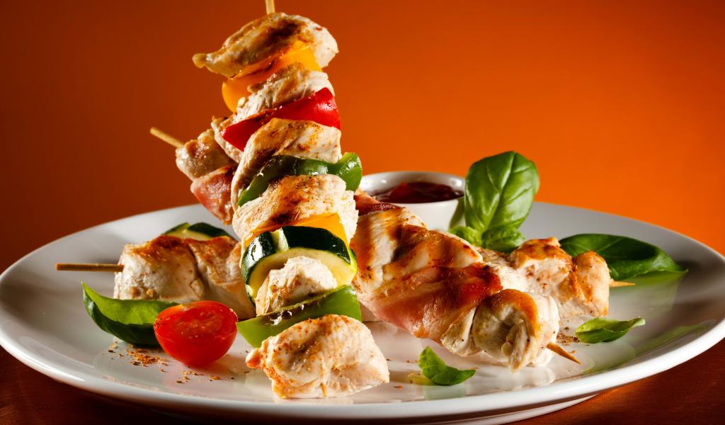 Обои Куриные шашлыки с овощами на белой тарелке