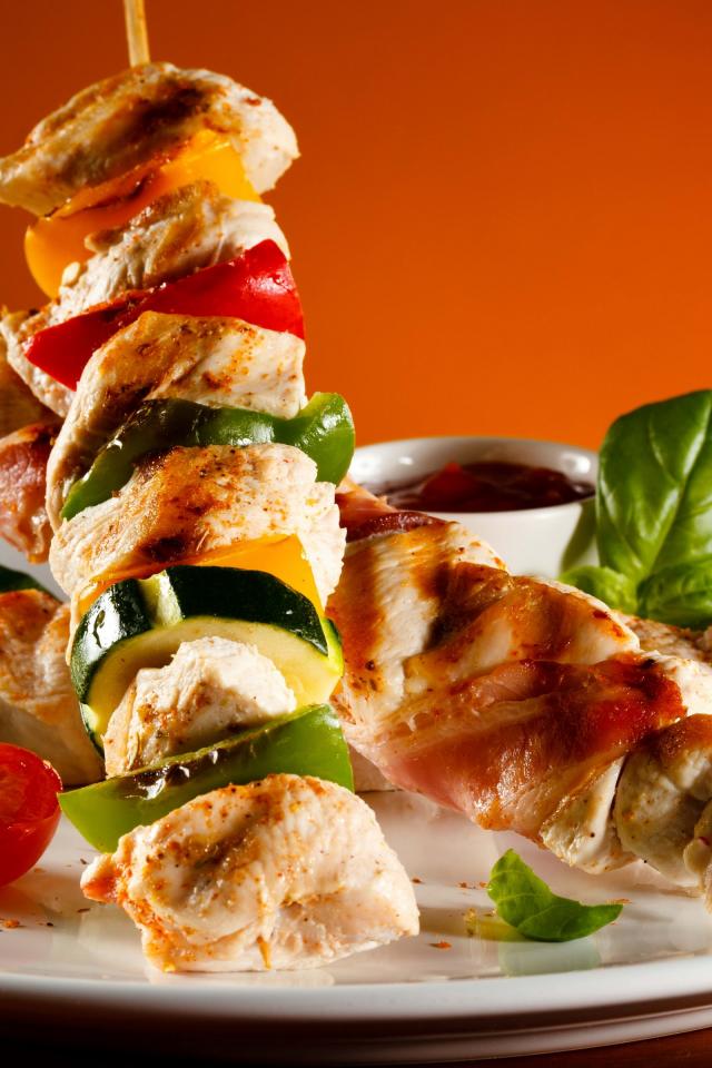 Обои Куриные шашлыки с овощами на белой тарелке